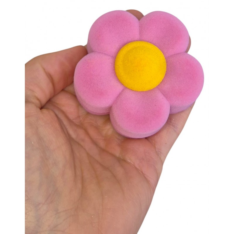 Różowe, welurowe pudełko w kształcie kwiatka, przeznaczone na pierścionek lub kolczyki.